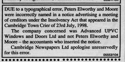 Due to a typographical error, the Cambridge Town Crier printed that Peters Elworthy & Moore was named in a notice advertising a meeting of creditors under the Insolvency Act. However, it was PEM who had placed the notice in the newspaper on behalf of a client.2002.